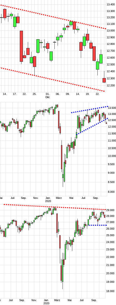 Wie weit der DAX noch steigen wird, hängt vom DOW ab. Der muss seine 29000 überwinden, damit der Weg frei ist. Entsprechend wird auch der DAX erst dann Richtung 13400 steigen können. Die Pflicht, das Gap zu schliessen, hat er ja erfüllt. Für die Kür muss der DOW weiter helfen. Charts: DAX-Tageschart, DAX-Wochenchart, DOW-Wochenchart.