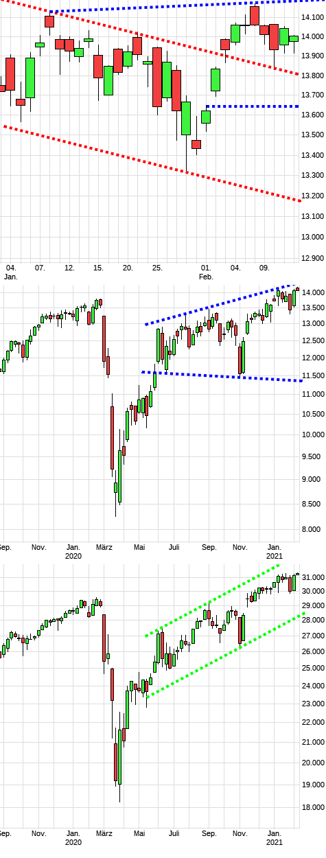 Der DAX bewegt sich weite rin seinen vorgegebenen Bahnen und testet jetzt die obere Trendlinie. Ein Ausbruch mit gleichzeitigem Sprung über die 14000 wäre mehr als positiv. Auch der DOW hat die 30000 verteidig und bewegt sich wieder in Richtung 31000. Charts: DAX-Tageschart, DAX-Wochenchart, DOW-Wochenchart.