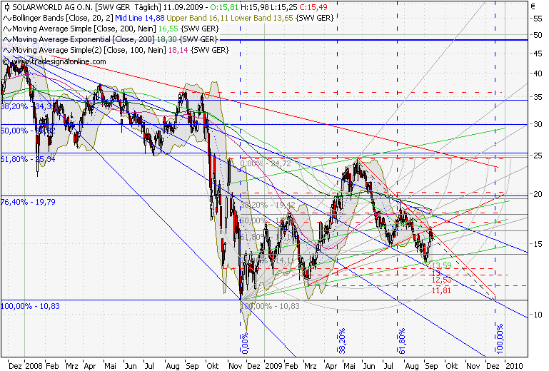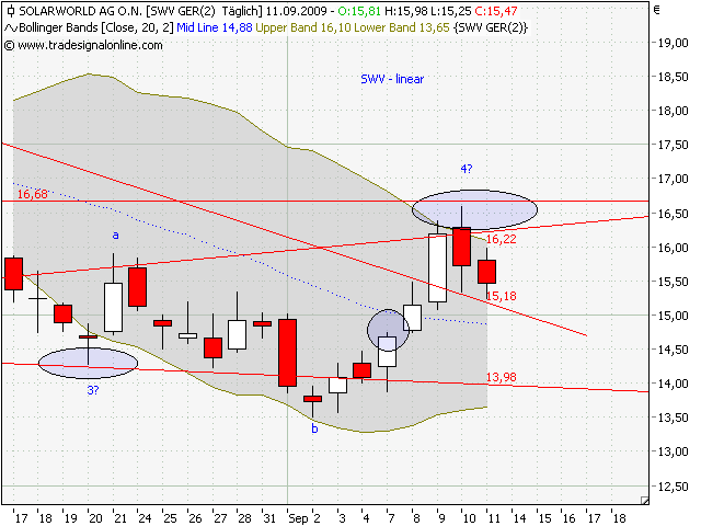 ich glaube auch nicht, dass solarworld diese woche noch mehr nachgeben wird. spätestens ab mittwoch dreht die aktie wieder richtung 16€ und wird am freitag so bei 16,40-16,60 schließen. grund ist der getestete wiederstand bzw. das obere bllinger band bei ca. 16,10. der kurs konnte nicht gehalten werden und jetzt wird noch mal kraft getankt um diesen wiederstand nachhaltig hinter sich zu lassen. vor genau einem monat stand die aktie bei 16,50 und dahin wird sie sicherlich auch wieder zurückkommen. die aktie hält sich nämlich im vergleich zu den letzten wochen recht gut. normalerweise überreagiert die aktie auf das schlechte marktumfeld, doch heute liegt sie mit dem minus ausnahmsweise mal niedrieger als der tecdax. das sagt mir, dass den bären langsam die luft ausgeht. seit 3 monaten wird die aktie runtergeprügelt und langsam dürften die tieftsstände bei 13,50 der vergangenheit angehören. der druck nach oben ist inzwischen im vergleich enorm hoch und der wird sich auch bald entladen.