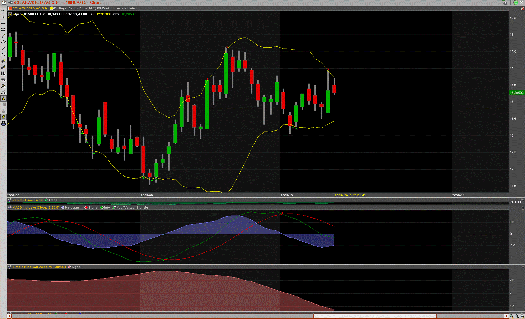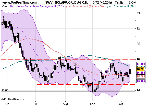 13.10.2009 - Mit Begeisterung wurde hier und da der gestrige Kursanstieg der Aktie von Solarworld aufgenommen. Doch so schön der Anstieg um mehr als 6,2 Prozent auch war, charttechnisch hat die Solarenergieaktie einen wichtigen Sprung auf dem Weg in Richtung 18,41 Euro verpasst. Während des Handels ging es bis 16,97 Euro, der Schlusskurs notiert bei 16,72 Euro. Die kombinierte Hürde aus der Horizontalmarke 16,77 Euro sowie der fallenden 100-Tage-Linie bei 17,03 Euro war damit ein zu großes Hindernis. Der Sprung über diesen Bereich hätte die kurzfristige Chartlage weiter verbessert und die Widerstandszone unterhalb von 17,64 Euro in den Blick gebracht – hier liegt auch das obere Ende des Bollinger-Bandes, das bei 17,40 Euro notiert. Die nächsten beiden Widerstandsmarken sind damit definiert, während Unterstützungen die Bereiche 16,35 Euro, 15,29/15,34 Euro und oberhalb von 14,77 Euro darstellen.