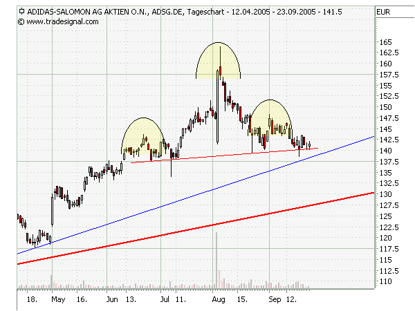 Neben dem Bild, das die Kurse liefern, wird dem Verhalten der Umsätze besondere Beachtung geschenkt. Das Umschlagen eines Aufwärtstrends in einen Abwärtstrend wird dadurch signalisiert, daß die Umsätze in der linken Schulter höher sind als in der Spitze und in der Spitze höher als in der rechten Schulter, daß sie aber beim Durchbrechen der Nackenlinie nach unten wieder zunehmen. Ein wichtiger Kernsatz der Technischen Analyse lautet: "Volume goes with the trend." (Hohe Umsätze bei Aufwärtsbewegungen der Kurse deuten auf weitere Kurssteigerungen. Hohe Umsätze bei Abwärtsbewegungen der Kurse deuten auf weitere Kurssenkungen.)