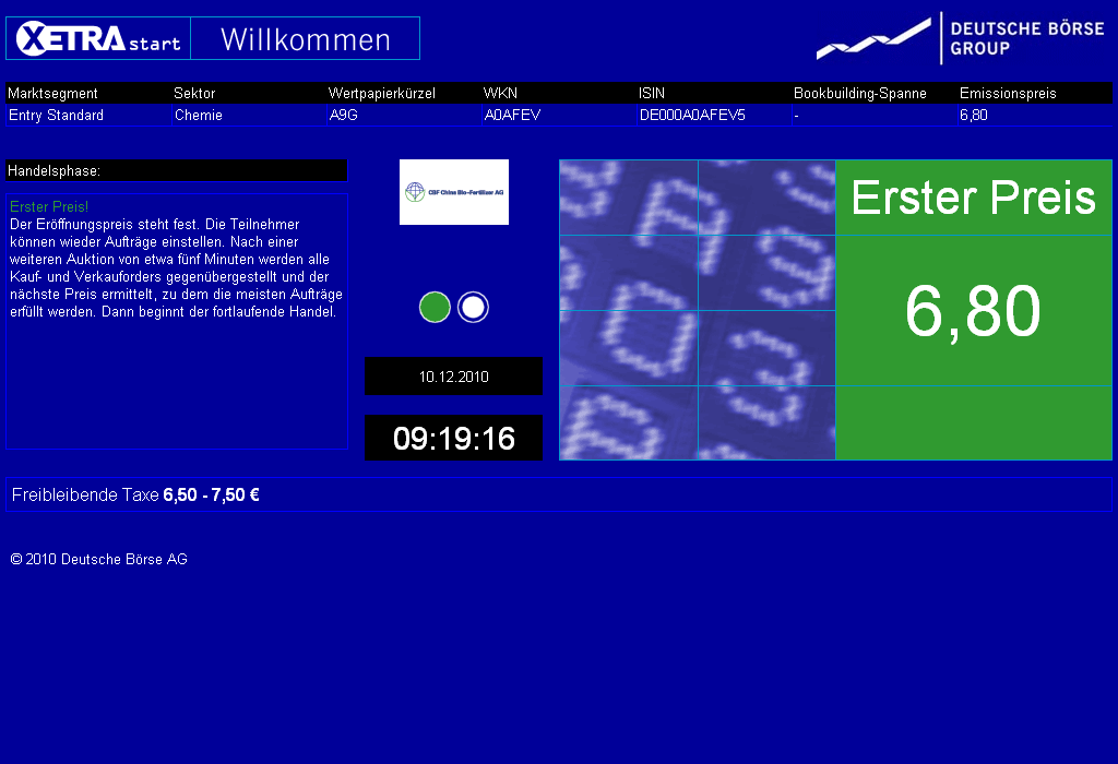 Hamburg, 09. Dezember 2010 - Die CBF China Bio-Fertilizer AG, die deutscheHolding eines chinesischen Herstellers von Bio-Düngemitteln aufbakterieller Basis, hat insgesamt 770.000 Aktien erfolgreich bei Investorenplatziert. Die Aktien wurden im Rahmen eines Private Placements zu EUR 6,80je Aktie ausgegeben und stammen vollständig aus einer im November von derHauptversammlung beschlossenen Kapitalerhöhung. Das Emissionsvolumenbeläuft sich somit auf EUR 5,2 Millionen. Das Unternehmen plant, den Erlösaus der Kapitalerhöhung u.a. für den Ausbau der eigenen Produktionsanlagenzu verwenden und damit die jährliche Produktionskapazität der Anlagen zuverdreifachen.