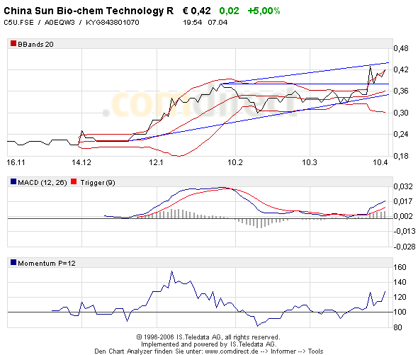 China Sun Bio-chem ist ein in Singapur ansässiges Biochemie-Unternehmen, das unter anderem aus Mais den Biokraftstoff Ethanol herstellt. Das Unternehmen ist derzeit dabei, seine Kapazitäten insbesondere in China deutlich auszubauen. Unternehmen, die in China tätig sind, unterliegen nach wie vor den dort üblichen staatlichen Reglementarien. China Sun darf sich Hoffnungen darauf machen, eine Lizenz für die Herstellung von Ethanol als Benzinersatz zu erhalten. Dadurch dürfte im nächsten Jahr ein Umsatz- und Gewinnsprung möglich sein, welcher der Aktie weiter Aufwind verleihen sollte. Beim aktuellen Kurs von 0,38 Euro ist der Wert mit einem 2007er-KGV von 7 moderat bewertet, zumal Effekte aus der erwarteten Lizenzvergabe dabei noch gar nicht berücksichtigt sind.