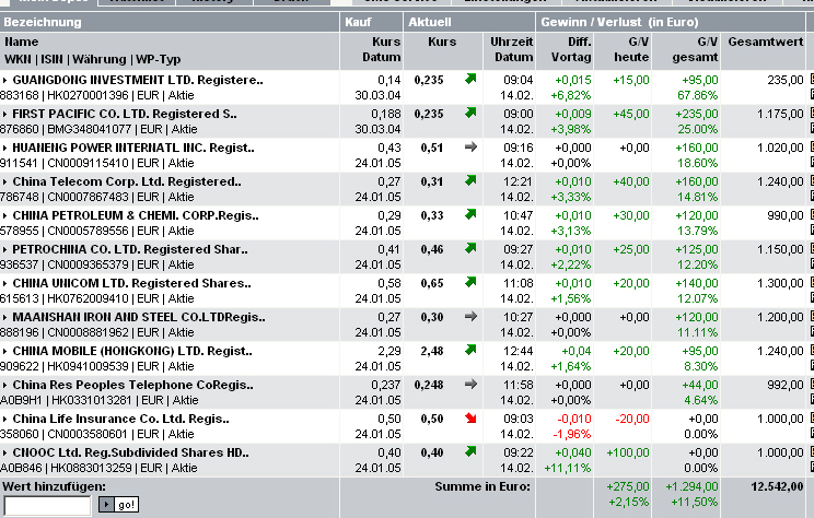 Ich bin z.B. in Sinopec Shanghai (WKN 887167) investiert, da Buchwert recht hoch sind und KGV im 6er Bereich schwebt. Zudem gibts ne ordentliche Dividende. Aktionärsherz was willst Du mehr.:-)