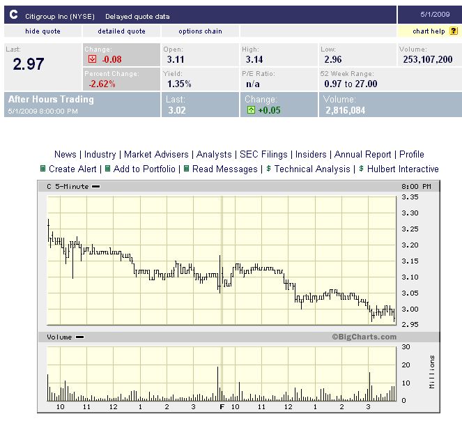 Diese Frage ist besonders interessant für Leute, die bereits investiert sind. Citigroup zählt offenbar zu denjenigen der 19 US-Banken, die durch den Stresstest der Regierung gefallen sind. Der zweite Durchfaller ist Bank of America, hinzu kommt noch mindestens eine größere US-Regionalbank.