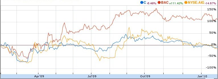 wenn man den chartverlauf der citi des letzten jahres (jan. 2009 bis heute) mit der anderen vergleichbaren pleitebank vergleicht (BAC - siehe grafik. die AIG habe ich auch drübergelegt, weil sich die charts von citi und aig so sehr gleichen - beide führungs- und planlos), dann sieht man, dass bei citi einiges schiefgelaufen ist. nicht nur was die anzahl der shares betrifft. und es weiss anscheinend immer noch keiner, wieviele leichen die citi wirklich im keller hat (zwischen $250mrd und $600mrd ist alles drinnen).