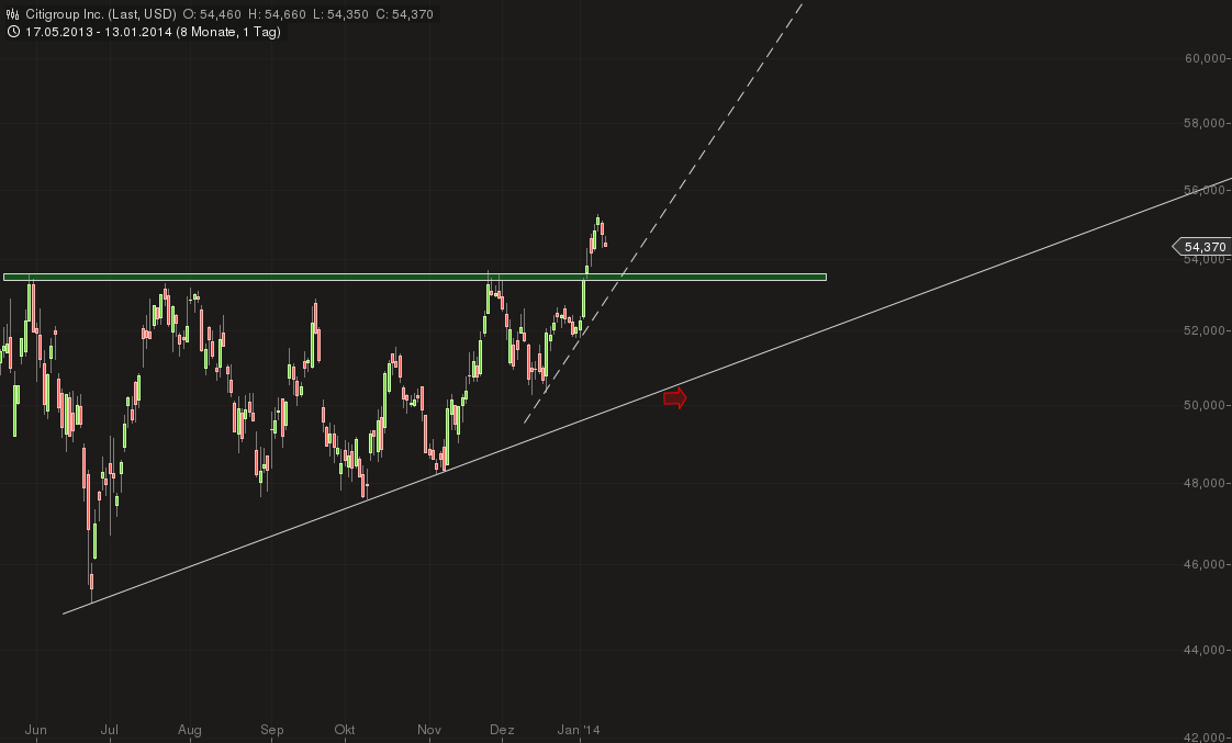 was hat denn die Citigroup mit dem DAX zu tun? Der Takt für den Aktienmarkt wird zudem noch immer in den USA vorgegeben, die alleine für über 25% !!! des Weltmarktes stehen. Die Citigroup ist eine der größten Banken der Welt und eine der effektivsten und am besten weltweit aufgestellten Banken noch dazu. Und das Unternehmen Citigroup läuft nach Krisenende längst wieder wie geschmiert und wird- davon bin ich fest überzeugt- auch wieder zur alter Dividendenstärke auflaufen. In Normalzeiten (vor der Krise) hat die Citi nach meinen Informationen weit über ein Drittel ihres Gewinnes als Dividende an die Aktionäre ausgeschüttet, was nach heutigem Stand einer Dividende von deutlich über einen Dollar/Aktie entspräche. Die Aussichten, dass dies in nicht allzu langer Zeit wieder so sein wird, sind meiner Meinung nach glänzend. Die US- Wirtschaft kommt immer mehr in Fahrt und durch die riesigen neuen Gasaufkommen werden die großen US Unternehmen energetisch preiswerter als die meisten ihrer Konkurrenten in der Welt wirtschaften können, was sich über kurz oder lang in den Ergebnissen/ Unternehmensgewinnen und damit auch im Geldbeutel der Mitarbeiter bemerkbar machen wird. Entsprechend mehr wird investiert, konsumiert, gekauft und finanziert werden. An allen Geldflussprozessen, in welcher Richtung auch immer, wird die Citigroup mit beteiligt sein. Ich für mich wüsste nicht, wie man diese positiven Aussichten nach oben hin noch toppen könnte. Der Aktienkurs der Citi hat wohl somit langfristig gesehen noch enormes Potenzial.