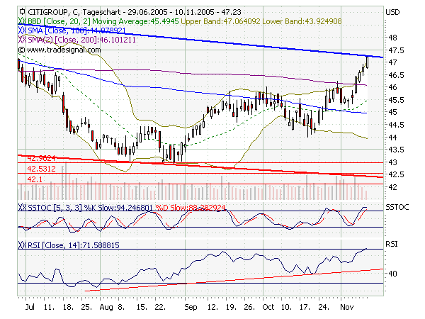 Der Titel ist mit einem KGV von 9,9 für 2006, einer Dividendenrendite von 4,0% und einer EK-Verzinsung von knapp 20% gegenüber anderen Finanzdienstleistern äußerst attraktiv bewertet. Mit einem Quartalsgewinn von 5,1 Milliarden USD kann man ohne weiters ziemlich zufrieden sein.