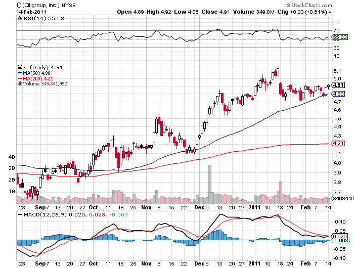 Shares of Citigroup moved up $0.03, or 0.61%, to close Monday at $4.91. Approximately 352 million shares traded hands for the day, versus an average day of 482.96 million shares. The stock remains above its 50-day moving average of $4.86 and its 200-day moving average of $4.31. Market capitalization currently stands at $142.64 billion and it has 29.05 billion outstanding shares.