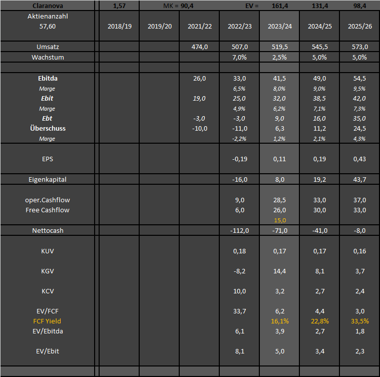 Die Hauptfrage ist für mich daher auch nicht, ob wir nun dieses Geschäftsjahr 8,0% oder 9,5% AEbitda Marge sehen, sondern wie man den Kapitalfluss zu beurteilen hat. Deshalb wäre für mich der Geschäftsbericht in Sachen Bilanz, Kapitalfluss und all die Details im Konzernanhang zu den zwei Bereichen enorm wichtig. Denn wenn das zu meiner Zufriedenheit so beantwortet wird wie ich es aktuell erwarte (Stichwort Währungsverluste etc), dann könnte man Ende des Geschäftsjahres 2024/25 schon nur noch bei knapp 40 Mio Nettoschulden bei 30-35 Mio € FreeCashflow stehen. Dann wäre die Unterbewertung dramatisch. Kommt man allerdings nicht in diese Regionen des FreeCashflows und kann sich dementsprechend auch nicht schnell genug entschulden, dann ist es ne andere Gecshichte. Aktuell bin ich aber ziemlich optimistisch, auch wenn sich das Posting wohl nicht so anhört. Ist halt ne Aktie wo der Ist Zustand aufgrund Konzernbilanz und Nettoverlust eine einzige Katastrophe ist, aber es sich innerhalb von weniger als zwei Jahren extrem in die genau gegenteilige Richtung verändern kann. Unter Umständen reden wir dann am Ende des Geschäftsjahres 24/25 schon von FCF Yield von 25-30%.