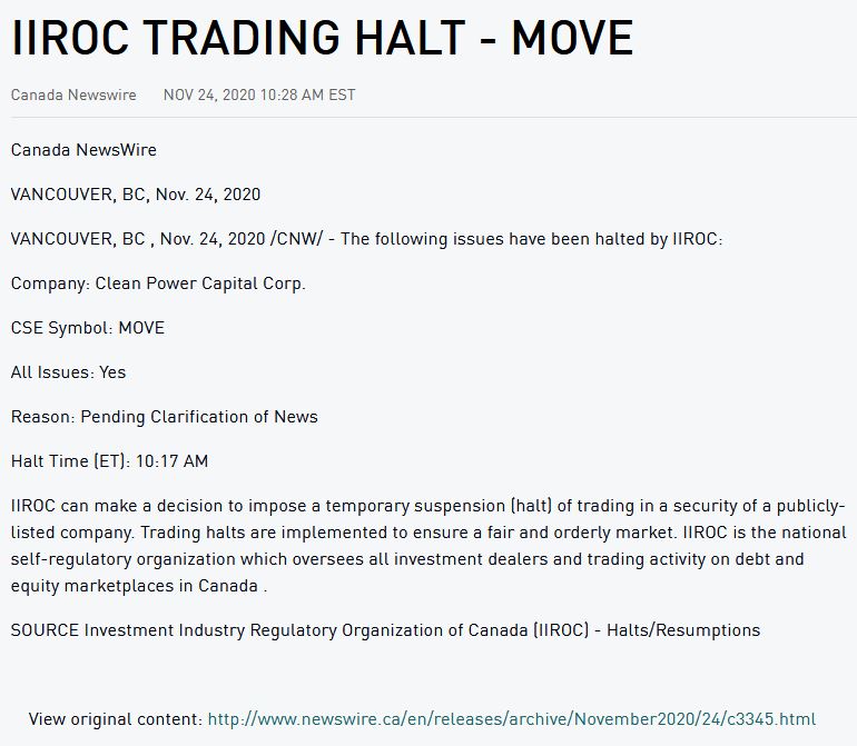 Clean Power Capital vom Handel ausgesetzt. 1223779