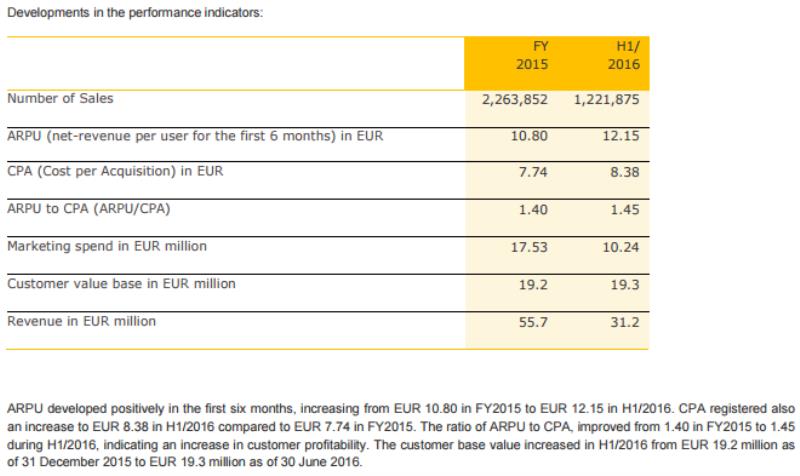 Die Effektivität der Optimierungsmaßnahmen schlägt sich einerseits in der Zahl der Verkaufsabschlüsse und andererseits in den Kosten pro Abschluss nieder (CPA). Zudem spielt der durchschnittliche Umsatz, der pro gewonnenen Kunden erzielt wird (ARPU, Kennzahl bezieht sich auf die ersten sechs Monate) eine entscheidende Rolle. So konnte CLIQ Digital den ARPU von 5,91 [2014] auf 10,80 [2015] bzw. 12,15 in H1/2016 erhöhen, was trotz der von 3,1 Mio. [2014] auf 2,3 Mio. [2015] bzw. 1,2 Mio. in H1/2016 rückläufigen Zahl der Abschlüsse ein Umsatzwachstum um über 30% auf 55,7 Mio. [2015] bzw. 31,2 Mio. in H1/2016 ermöglicht hat. Da sich die Kosten pro Abschluss nur unterdurchschnittlich erhöht haben (die Quote ARPU/CPA ist von 1,35 [2014] auf 1,40 [2015] bzw. 1,45 in H1/2016 gestiegen), konnten die Düsseldorfer das Nettoergebnis auf 1,4 Mio. [2015] und 1,2 Mio. in H1/2016 mehr als verdoppeln. (Quellenangaben: aktien-global.de)