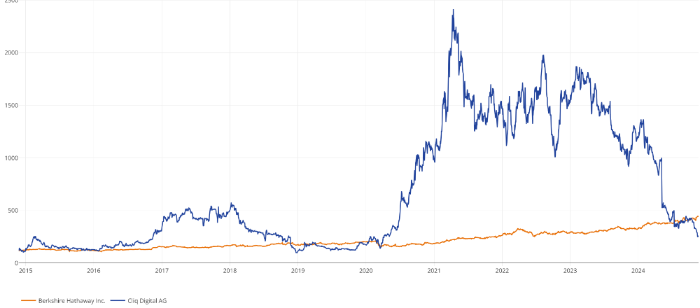 In der Tat: Mit CLIQ Digital lässt sich die lahme Ente Bershire Harhaway nicht vergleichen (siehe Chartvergleich unten):