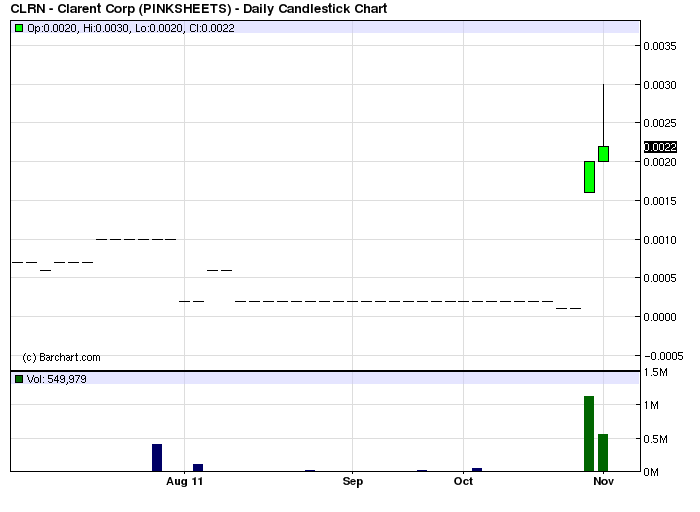 clarent corp (CLRN) hat gestern und heute sowohl an handelsvolumen und kurs stark boden gut gemacht. zur zeit notiert der kurs bei 0,002x0,0024. der hauptausbruch sollte die nächsten tage folgen. der chart sieht konstant stabil aus. es befinden sich laut datenbank nur 41 milionen aktien im umlauf. nach 0024-003 wird das gap gross zu 008. spricht für sich. könnte eine gute nummer werden.