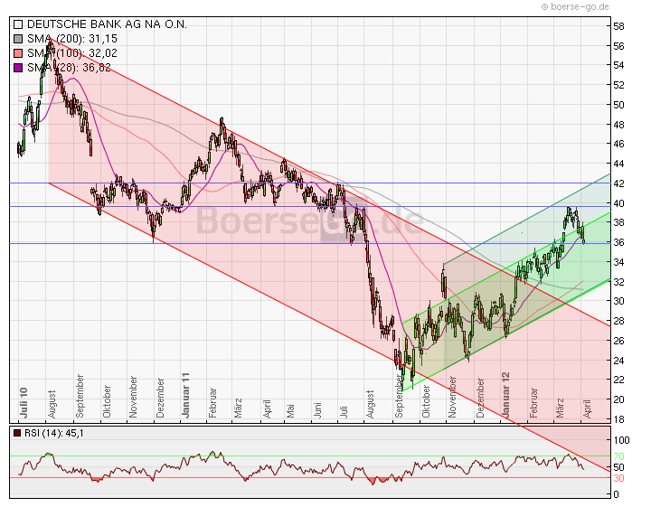 Vermutlich wird der Durchbruch durch den Widerstand bei 40 in der zweiten Woche nach Ostern erneut in Angriff genommen, wenn bis dahin die Eurokrise nicht wieder an Fahrt gewinnt. Aber eigentlich will sie niemand mehr sehen, denn alle sind ihrer überdrüssig! Abwarten und Tee trinken! Denn fundamental bleibt die DB extrem unterbewertet und ich sleber rechne nach einer Norminalisierung des Bankensystems mit Kursen, die locker die 70€ überschreiten sollten. Hier bleibt nur die Frage offen, ob sich dieses System vollkommen erholen wird. In der Vergangenheit war dies immer der Fall, selbst 1929, als die unmittelbaren Folgen viel extremer waren! Doch wir leben heute in einer anderen Welt mit ganz anderen Herausforderungen!