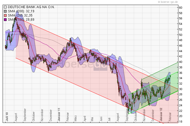 20 und 28 Tageslinie hat die 200 Tageslinie von unten durchbrochen: Kaufsignal. Wieder kam Querfeuer dem Kurs der DB zuwider: Euro, Moody's, Griechenland, Kirch und nochmals Moody's für Banken.