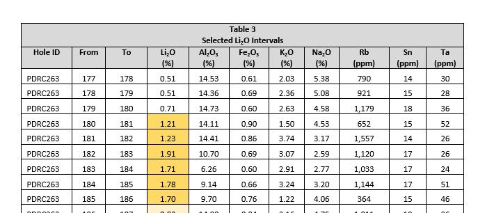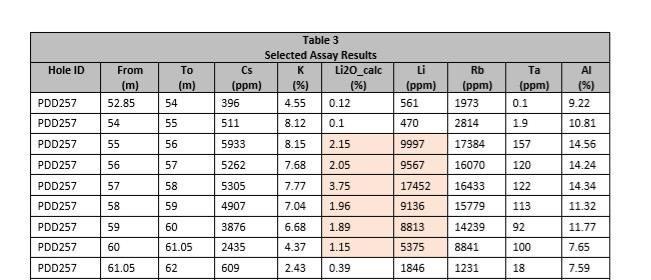 - Spodumen Ziel 1 hatte 5 Löcher fertiggestellt, die alle Pegmatit mit einer maximalen Dicke von 15 m schneiden.