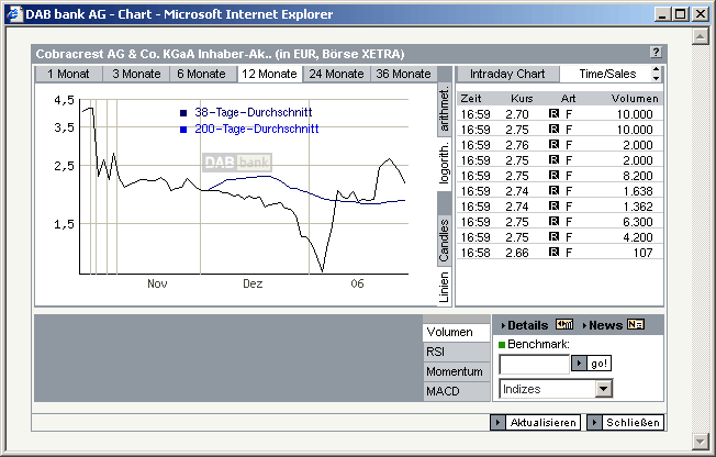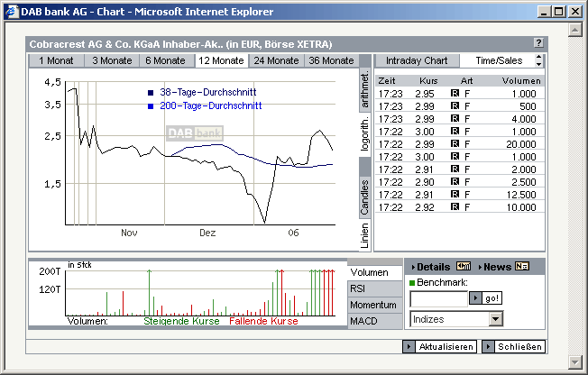 Carlyle International Inc., New York, hat kursbedingt seine Aktienpositionen drastisch ausbauen können und hält direkt und indirekt deutlich über 97% aller Aktien. Bei den indirekten Positionen handelt es sich nach Mitteilung der Carlyle International Inc. um Bestände von Aktionären, die bereits gegenüber der Carlyle International Inc., New York, mitgeteilt haben, dass man entweder das Umtauschangebot zu € 7,03 (equity swap) annehmen werde, bzw. in der Cobracrest AG & Co. KG aA investiert bleiben möchten.
