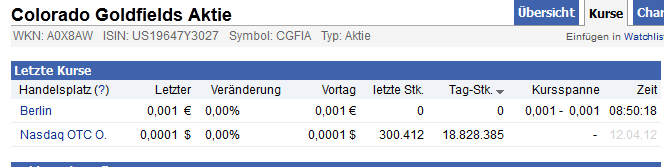 | 20 | ++Colorado Goldfields+ + News, Fakten, Daten... | DaxiDowi | Mr. Vorsicht | 02.05.13 11:53 | ||