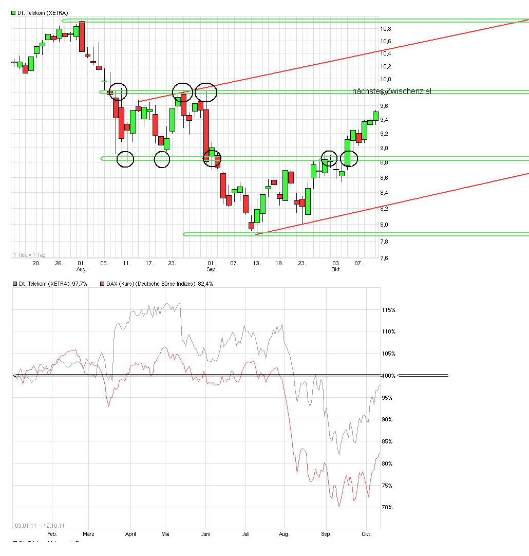 Dt. Telekom offenbar weiter auf Kurs zum nächsten Zwischenziel/horizontalen Widerstand von ca. 9,80/85. Wenn man mal schaut wie die Performance seit Jahresanfang 2011 ist und auch noch die letzte satte Divi. der Telekom hinzurechnet, dann sind Telekom-Aktionäre schon wieder im Plus für 2011, während der DAX noch weit davon entfernt ist. Sollte 2012 sich abzeichnen der AT&T Deal geht noch durch, dann wird die Rakete nochmal richtig zünden über 11€. Aktuell ist ja ein Scheitern schon eingepreist. Somit läge das Überraschungspotenzial doch wohl eher auf der Oberseite