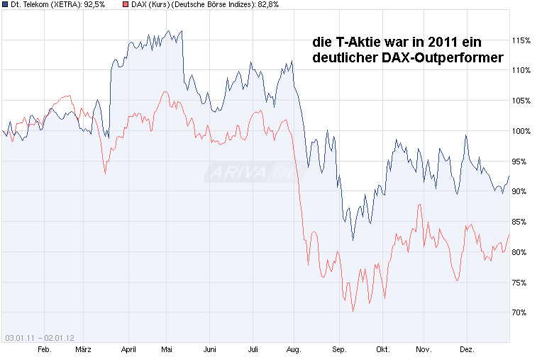 Wünsche allen Interessierten rund um die T-Aktie erstmal ein gutes neues Jahr. In 2011 konnte die T-Aktie sich im allgemeinen Börsen-Chaos relativ besser behaupten als der DAX. Und wenn man die in 2011 stattgefundene Divi-Ausschüttung hinzurechnet, dann haben Aktionäre der T-Aktie in der Summe wertmäßig sich gut gehalten. Der Telekom-CEO hat jüngst nochmal bestätigt, daß die nächsten beiden Jahren auf jeden Fall die Divi bei mindestens 0,7€ pro Jahr bleiben wird ( http://www.newratings.de/du/main/company_headline.m?id=2239884) . Das der Deal mit AT&T nicht durchkommt wurde schon lange im Vorfeld weitestgehend eingepreist. Zudem wird man von AT&T einige Mrd. an "Schmerzensgeld" (break up-fee) dafür bekommen, daß man jetzt nach einer neuen Lösung Ausschau halten muß. Vielleicht läßt sich noch ein Plan B finden, um die US-Tochter auf einem anderen Weg an andere Interessenten zu veräußern oder eine Kooperation mit einem anderen Player zusammen einzugehen ( z.B. der US-Hedgefond Harbinger, der PayTV-Konzern Dish, Netzwerkpartnerschaft mit Clearwire, Zusammenarbeit mit Sprint Nextel etc. etc.). Wenn es der Telekom weiter gelingt mittels Effizienzsteigerung, Kostensenkungen, etc. die gegenwärtigen Umsatzmargen zu halten und dabei auch gleichzeitig weitere Umsatzbringer neu zu entwickeln, dann könnte man hoffentlich 2011 erstmal für eine längere Zeit das Low beim Kurs gesehen haben und mittelfristig wieder die Zweistelligkeit beim Kurs ins Auge gefaßt werden. Durch die hohe Ausschüttungsquote gibt es jedoch immer die etwas größeren Rücksetzer am Tag nach der HV. Solange man diese Lücken im Verlaufe eines Jahres wieder schließen kann und die Divi-Rendite weiter stimmt, bleibt die T-Aktie eine sinnvolle konservative Beimischung für ein Aktiendepot. Es bleibt aber natürlich generell immer ein übergeordnetes Risiko in Form der Gesamtbörse. Sollte es im Verlaufe von 2012 wieder deutlich abwärts gehen und dabei der DAX die 5000 nochmal von unten anschauen, dann dürfte auch eine T-Aktie sich solchen Entwicklungen nicht ganz entziehen. Wer dafür nicht die Nerven hat oder keine Lust hat höheren Verluste temporär im Depot zu sehen, der sollte auch bei der T-Aktie sich ein SL im Hinterkopf zu haben. Gilt aber für so ziemlich alle Aktienwerte. Also warten wir mal ab was das Jahr für Überraschungen bringt. Nach dem Jahr 2011 wäre es nett es würden mal wieder mehr positive Überraschungen auftauchen ;)
