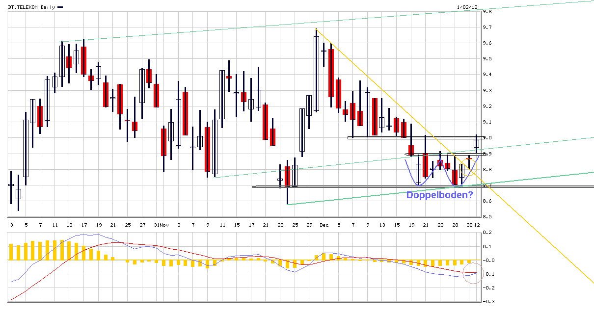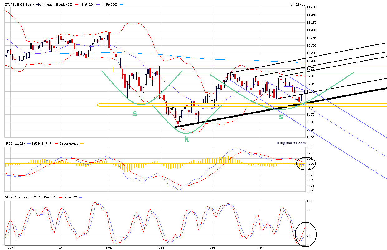 Nach untenhin scheint die horizontale Unterstützung im Telekom-Chart im Bereich 8,50/75 weiter zu stützen. Ein Scheitern des AT&T Deals wurde ja eh schon vor Monaten eingepreist. Von daher könnte sich vielleicht jetzt die rechte Schulter einer inversen SKS ausbilden. Allerdings wäre die erst abgeschlossen, wenn es auf SK über 9,80 ginge. Da müßte sich die gesammelte Fondmanager-Riege aber jetzt endlich mal zusammenreißen und sich auf ihre Jahresboni konzentrieren. Schließlich müssen dafür die Kurse im Gesamtmarkt bis Jahresende noch deutlich höher stehen, damit es dicke Boni gibt, da die von der Jahresperformance abhängen. Da es nurnoch 4 Wochen sind die dafür übrigbleiben, müßte man ab jetzt alles Negative negieren/abwiegeln und sagen der Markt ist total überverkauft und alles wird in 2012 eh wieder zum Guten werden. Ob es 2012 so kommt bleibt abzuwarten. Aber ich denke Fondmanger denken in erster Linie an die eigene Brieftasche und werden das die nächsten 4 Wochen nach außen so verkaufen als ihre "Überzeugung". Im Grunde war ja auch zuletzt die Stimmung an der Börse schlechter als die eigentliche fundamentale Lage gewesen. Der IFO war z.B. letzte Woche besser als erwartet und auch die Lokomotive USA bekommt von den Verbrauchern wieder mehr Schubkraft ( Neuer Umsatz-Rekord im US-Einzelhandel am "Black Friday" Sonntag, 27. November 2011-de.reuters.com/article/economicsNews/idDEBEE7AQ01020111127 )
