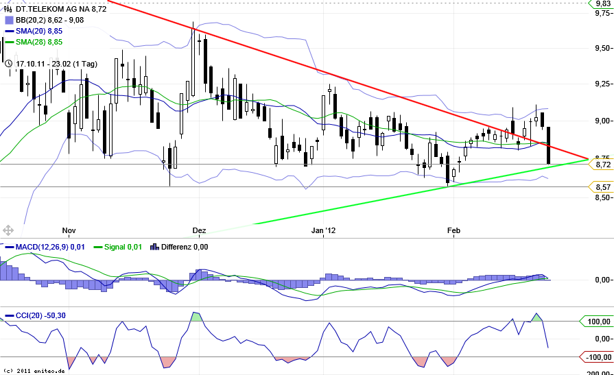 Charttechnischer Ausblick:Das Sentiment in der Deutschen Telekom Aktie ist weiterhin bärisch zu werten. Die jüngsten Verkaufssignale sind noch aktiv und erst oberhalb von 9,15 Euro würde sich dies ändern. Eine Kaufwelle bis auf 9,61 Euro wäre im Anschluss an dieses Kaufsignal möglich.
