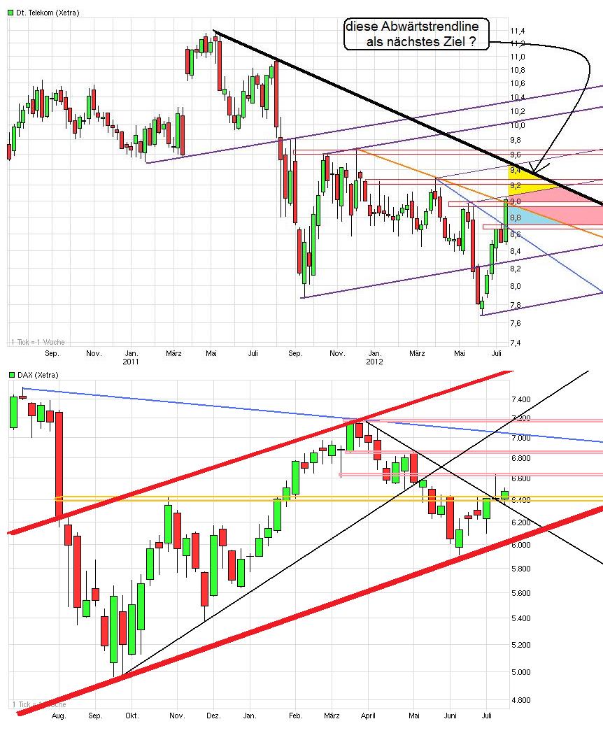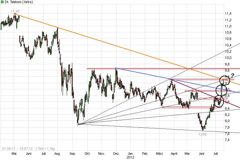 Also ich denke, wenn der DAX sich nachhaltig über der Region 6400/430 wieder festigen sollte, dann wären nach oben im Jahresverlauf noch einige hundert Punkte im Köcher und die T-Aktie könnte noch die Abwärtstrendlinie in Angriff nehmen die seit Mai 2011 fällt. Der Markt könnte zwar im Sommer nochmal etwas wild hin und her zucken, aber spätestens ab Ende September sollte dann wieder die US-Wahl die Märkte in den Bann ziehen. US-Wahl Jahre sind in der Regel gute Börsenjahre.(http://boerse.ard.de/content.jsp?key=dokument_584776 => 05.01.2012 7Kaufen, wählen, freuen! ...US-Wahljahre sind gute Börsenjahre. Diese Regel hat seit über 100 Jahren mit wenigen Ausnahmen einwandfrei funktioniert. Auch Privatanleger können sich die Erkenntnisse des US-Präsidentschaftszyklus zunutze machen...") . Ich rechne damit, daß es nicht mehr in 2012 nochmal richtig tief runtergehen wird, sondern es dann 2013 nochmal richtig tief runtergeht an den Weltbörsen. Von daher hoffe ich mal die T-Aktie wird sich Richtung Jahresende weiter über der 9€ Marke halten und sich eher noch der Region um die 9,6€ annähern. Am 9. August kommen die Hj.1 Zahlen und dann wird man ja sehen, ob der Markt gegenwärtig zu optimistisch ist bzgl. der T-Aktie. Aber unabhängig davon was man glaubt oder hofft, habe ich als Airbag stets SL bei meinen Posis, da es nicht gut ist sich alleine gegen Mr. Market zu stellen ;)