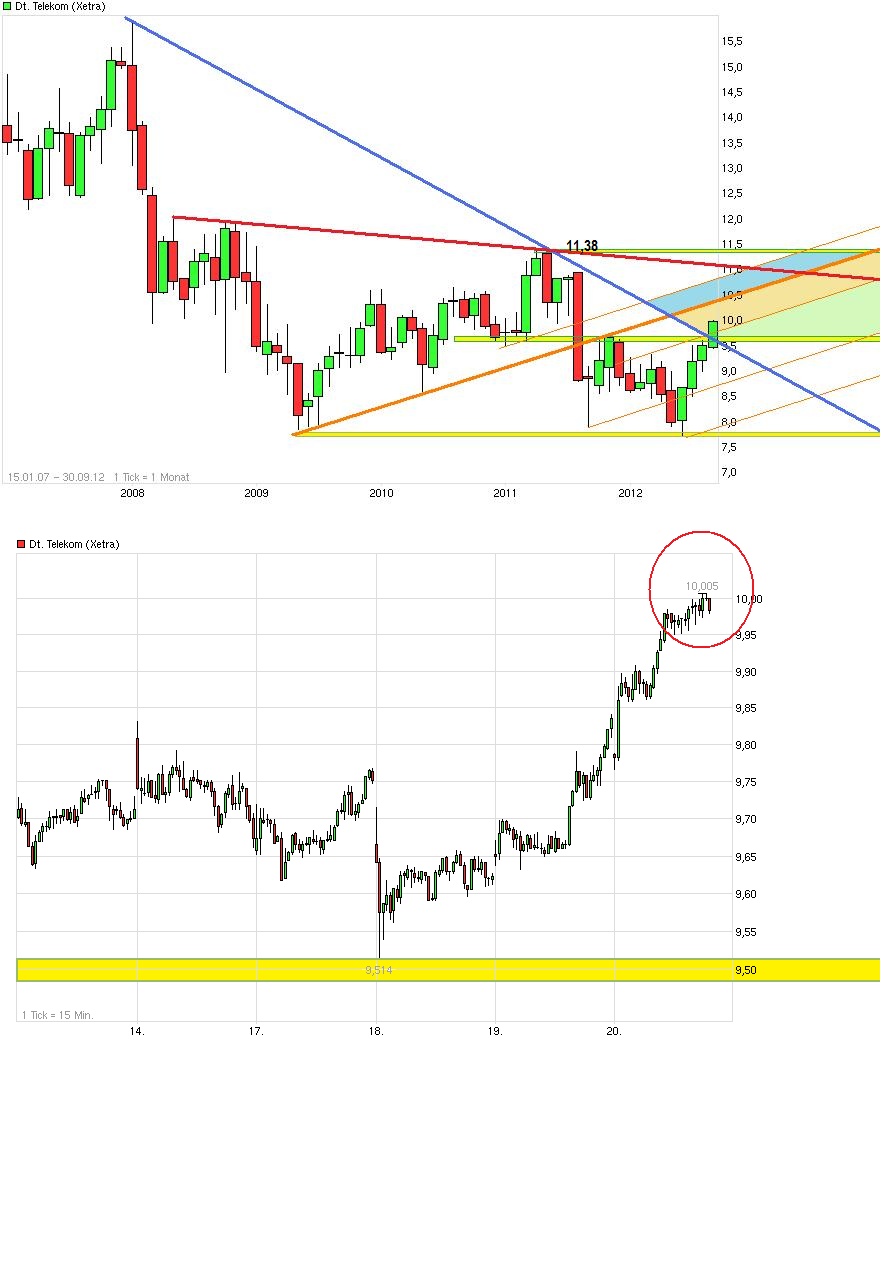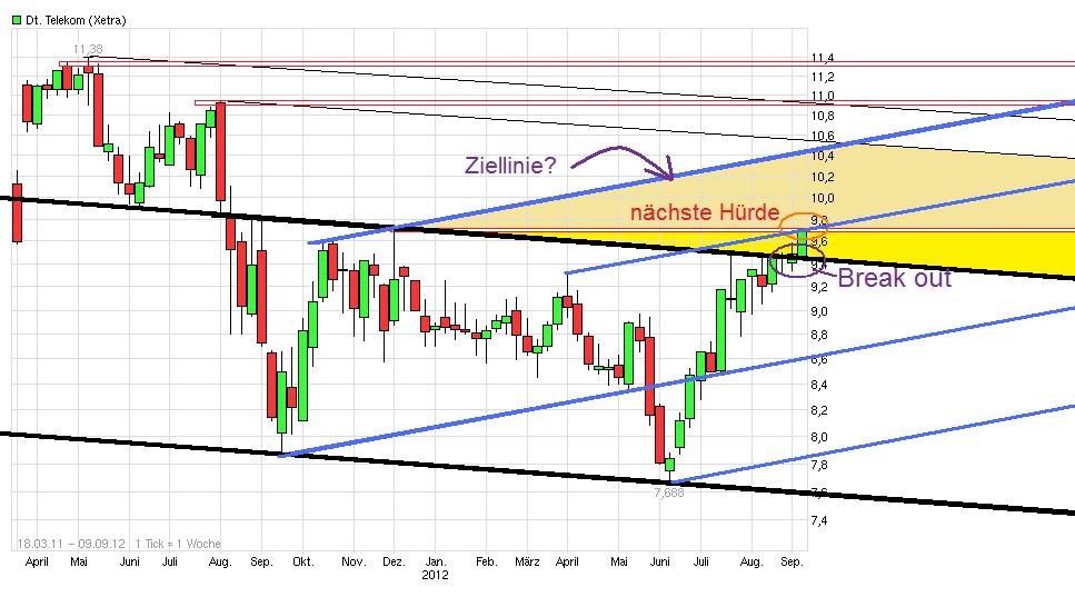 Heute zwischenzeitlich die T-Aktie wieder im zweistelligen Bereich. Schauen wir mal, ob das jetzt nur dem großen Verfallstag morgen geschuldet ist (runde Zahl) oder ob man das in den nächsten Wochen nachhaltig hinbekommt. Nachdem man die horizontale Widerstandsregion um die 9,50 jetzt scheinbar nachhaltig hinter sich läßt, könnte man sich die nächsten Quartale/bis zur nächsten HV vielleicht noch weiter hocharbeiten Richtung der 11,38 von Mai 2011. Die T-System Meldung von heute hilft sicher auch mit. Erfreulich, daß T-System es schafft immer wieder große Aufträge auch im Ausland zu aquirieren.
