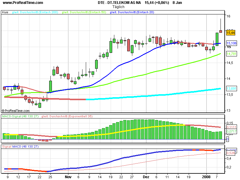 Berlin - Die T-Aktie feiert 2008 ihr Comeback. Das sehen zumindest einige Analysten so, die bei der Aktie aus verschiedenen Gründen jetzt zum Kauf raten. Nach einer langen Zeit mehr als enttäuschender Kursentwicklung soll die Deutsche Telekom ihren Aktionären in diesem Jahr wieder so richtig Freude bereiten. Die Credit Suisse zum Beispiel setzt darauf, dass das Unternehmen bei Vorlage der 2007er Zahlen einen höheren Gewinn vermelden wird als bislang prognostiziert. Der Aktie wird ein Kursanstieg auf 17,50 Euro zugetraut. Die technischen Analysten von HSBC Trinkaus bezeichnen die Telekom gar als "potenzielle Investmentüberraschung 2008" mit einem Kurspotenzial bis 19 Euro. Das wäre vom aktuellen Niveau aus ein Plus von rund 25 Prozent.Positive Analystenkommentare zur Telekom gab es in der der Vergangenheit allerdings schon häufiger. Und nicht selten konnte die Aktie die hochgesteckten Erwartungen im Endeffekt dann nicht erfüllen. So haben Anleger in den vergangenen drei Jahren lediglich an den ausgeschütteten Dividenden verdient. Kursgewinne gab es unter dem Strich keine. Damit zählte die T-Aktie in diesem Zeitraum zu den mit Abstand schwächsten Werten im Dax. Der Index selbst legte indes über 80 Prozent zu.Für vorsichtige Investoren, die dem Optimismus der Banken mit einer gewissen Skepsis begegnen, können Zertifikate auf die Deutsche Telekom eine interessante Alternative sein. Je nach Risikofreude und Markteinschätzung bieten sich dabei verschiedene Varianten an. Gleich ist bei allen Papieren, dass die während der Laufzeit ausgeschütteten Dividenden verloren gehen. Diese werden vom Emittenten einbehalten. Dafür erhalten Anleger aber einen Mehrwert gegenüber normalen Aktionären.Garantie-Zertifikate zum Beispiel bieten die Sicherheit, dass am Ende der Laufzeit ein festgelegter Betrag auf jeden Fall zurückgezahlt wird. Ganz egal, wie sich die Aktie bis dahin entwickelt. Kursverluste sind damit ganz oder zumindest größtenteils ausgeschlossen. Gleichzeitig partizipiert der Anleger zu annähernd 100 Prozent an Kurssteigerungen der Aktie.Bei einem solchen Kapitalschutz-Zertifikat der BHF Bank gibt es im Juni 2010 zum Beispiel garantierte 15 Euro zurück. Auch dann, wenn die Telekom wieder auf zehn Euro zurückfallen sollte. Bei einem aktuellen Kurs des Zertifikats von rund 15,80 Euro ist das Risiko auf 80 Cent oder fünf Prozent begrenzt. Klettert die Aktie bis auf 19 Euro, wird auch das Zertifikat zu 19 Euro zurückgezahlt. Weil das Garantie-Papier etwas teurer als die Aktie ist, fällt der prozentuale Anstieg in diesem Fall leicht geringer aus. Dafür bestehen aber so gut wie keine Risiken (WKN: