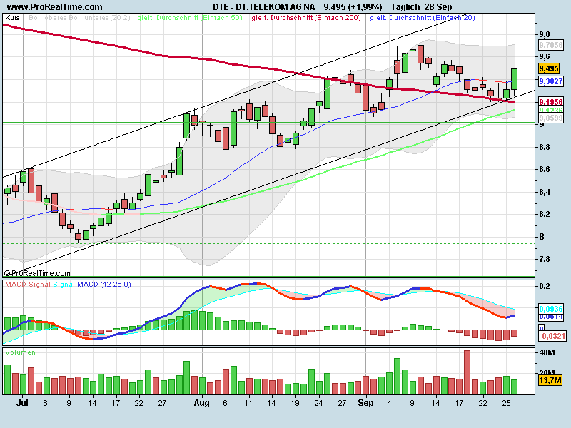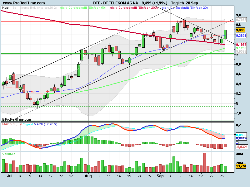 Die Halbjahresbilanzen der großen Konzerne fielen durchweg besser aus als erwartet, doch hat sich das bei der Performance in diesem Jahr noch nicht gezeigt. "Die europäischen Telekommunikationsaktien haben im bisherigen Jahresverlauf schlechter als der Gesamtmarkt abgeschnitten und sind damit reif für eine Jahresendrallye", urteilt Robert Grindle, Analyst der Deutschen Bank, der sein Kursziel für die Aktie der Deutschen Telekom von 11, 10 auf 12 Euro angehoben hat. Vor allem die beginnende Stabilisierung des Mobilfunkgeschäftes berge Potenzial, so Grindle in einer Branchenstudie vom 13. September. Da die Einnahmen auch in der Krise sprudeln, winkt Anlegern zudem eine satte Dividendenrendite von knapp neun Prozent - einem Vielfachen des Anleihezinses.