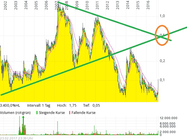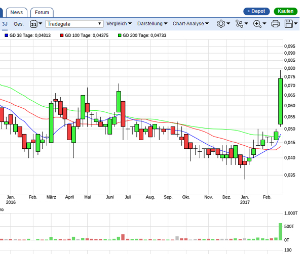 Bei 6,5 Euro-Cent brach der Kurs damals Ende Dezember unter kleinem Volumen
