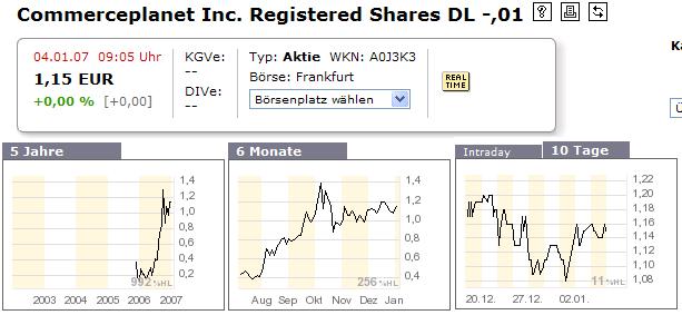 CommercePlanet hat im Q1/2006 den Turnaround vollzogen, nachdem man in 2005 noch defizitär war. Seitdem wächst man nahezu unaufhaltsam, was die u.a. Tabelle eindrucksvoll belegt. Man publiziert Quarterly-Results, eine GuV bzw. Bilanz habe ich aber nicht gefunden. Könnte damit zusammenhängen, dass man erst seit Ende Juni 2006 notiert (zumindest in Frankfurt). Man ist seit dem Q3 offensichtlich komplett schuldenfrei, nachdem alle Forderungen aus dem operativen CashFlow getilgt wurden.