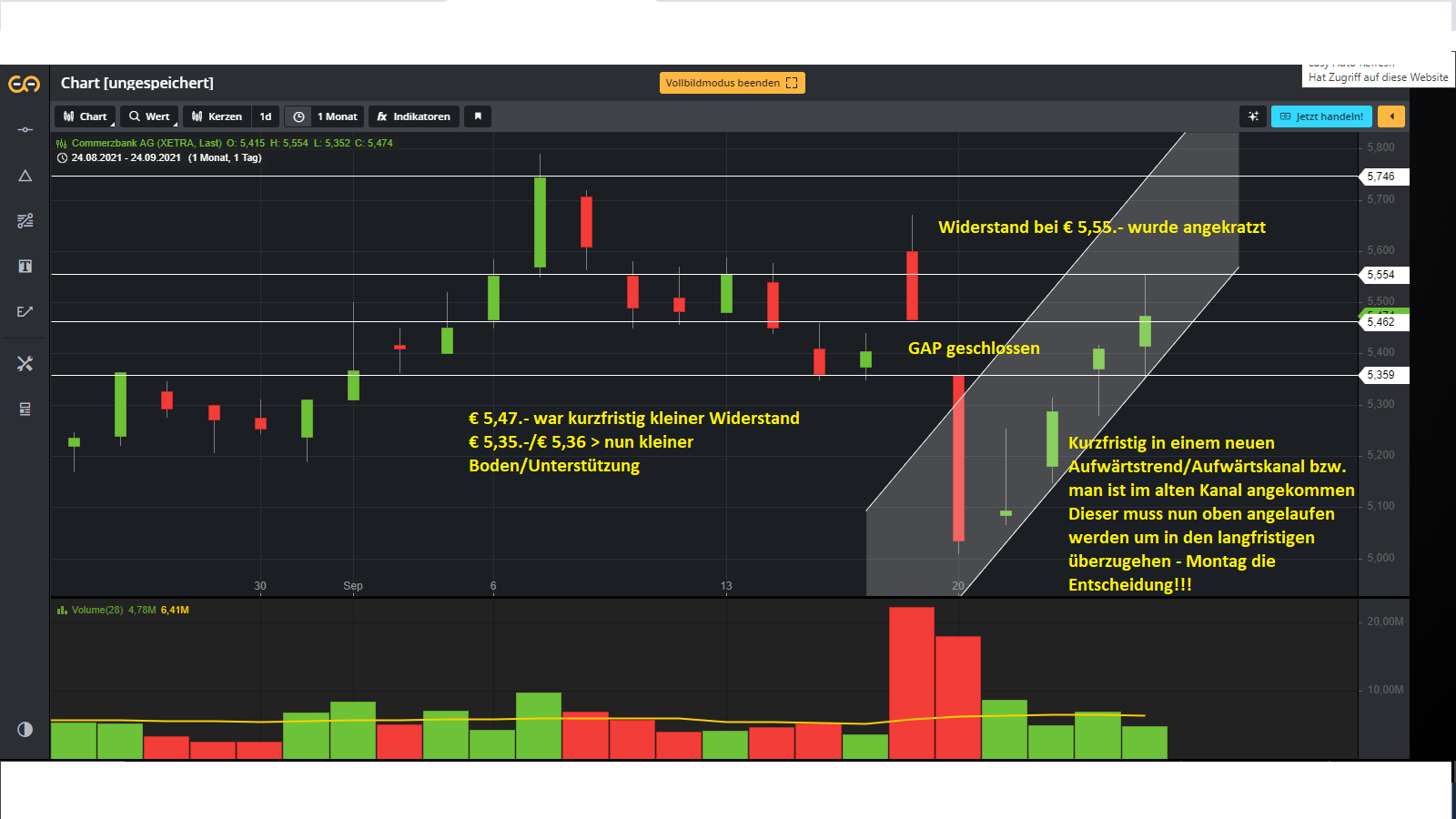 zum Tippspiel, es ist unklug seinen Tipp nun schon zu verfassen. Wir haben Wahlen und die werden am Montag m.M.n. für eine kräftige Volatilität sorgen. (meist sind politische Bewegungen nur von kurzer Dauer, können dennoch hilfreich sein um Wiederstände zu überwinden). Ich nannte einige Marken, was Kurse angeht und brachte diese in meinen ersten Chart mit ein. (€ 5,35 - € 5,47.- € 5,55)