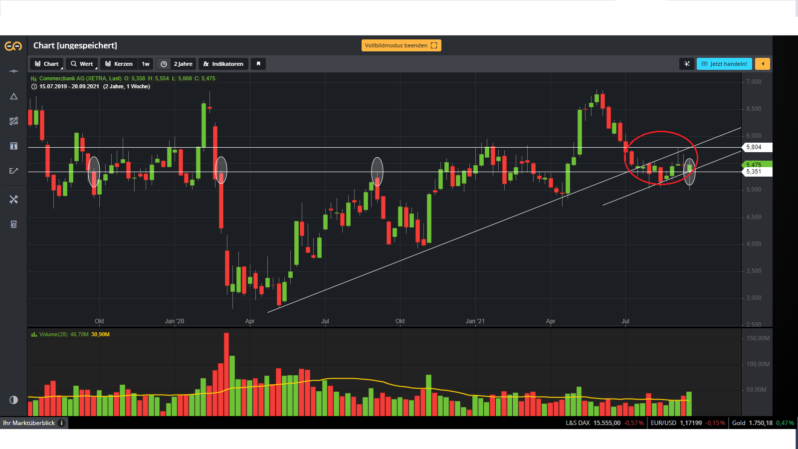 Es gibt also am Montag entweder abgestandenes Wasser oder man kann den Sekt aus dem Kühlschrank holen. Ich gehe davon aus das wir in eine Richtung knallen werden. Also es wird einen schönen Peak geben. Dieser katapultiert uns nach oben in den langfristigen Aufwärtstrend oder er schickt die COBA in die Versenkung.