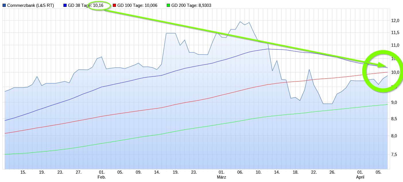 In den nächsten Wochen wird sich der Blick auf die Zahlen der Banken zum 1. Quartal richten. Hier hoffe ich für die DBK die Markterwartungen deutlich zu übertreffen. Das könnte erhebliches Potenzial freisetzen. Die DBK muss beweisen, dass sie in diesem Jahr in der Lage ist, einen höheren Gewinn als im letzten Jahr, ohne Einmalerträge von 1,4 Mrd. Euro zu erwirtschaften. Schafft Sie das, geht es hier in Richtung 20 Euro. Bei der CoBa bin ich mir fast zu 100% sicher, dass man sehr, sehr gute Zahlen zum 1. Quartal vorlegen wird. Hier sollte dann auch endlich der Knoten platzen.