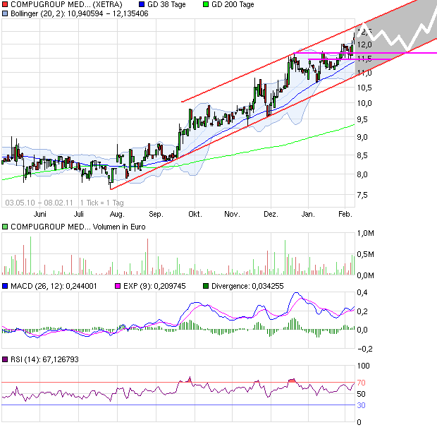 Im vergangenen Jahr habe CompuGroup Medical bei einem Umsatzanstieg um 7% auf 313 Mio. Euro das operative Ergebnis vor Abschreibungen (EBITDA) um 14% auf 67 Mio. Euro gesteigert. Im laufenden Turnus solle bis zu 420 Mio. Euro umgesetzt und ein EBITDA in einer Bandbreite von 86 bis 93 Mio. Euro erwirtschaftet werden.