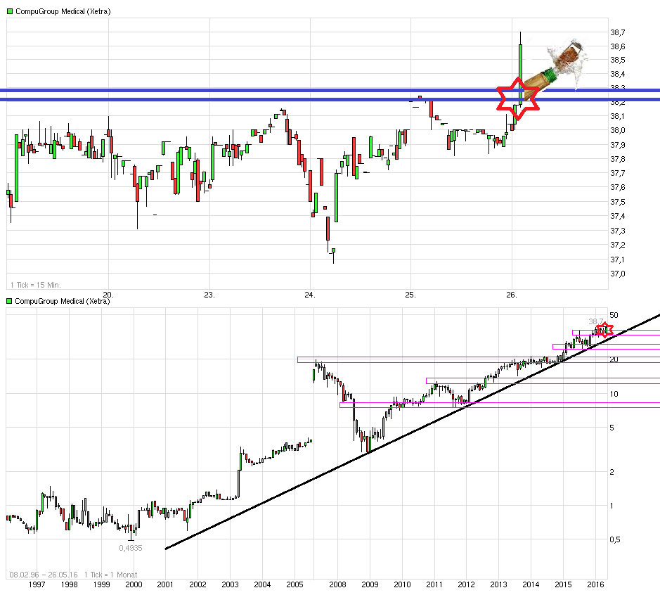 Die Region 38,00/38,33 ist wirklich ein Brett, wo man etwas intensiver bohren muß, um da endlich einen Ausbruch zu schaffen Richtung der 40er Marke. Man muß aber auch bedenken, daß jüngst ja auch noch der DiviAbschlag um 35 Cent war und man das schon wieder völlig aufgeholt hat. Insofern hält man sich eigentlich sehr gut, nur der nächste Schritt müßte dann auch bald mal kommen. Bei 38,24 hat man heute dann wieder etwas den Mut verloren. Also keine 10 Cent hätten mehr gefehlt, um die 38,33 zu überbieten. Oder gibt es jemanden der den Ausbruch bewußt erstmal weiter eindeckeln möchte?