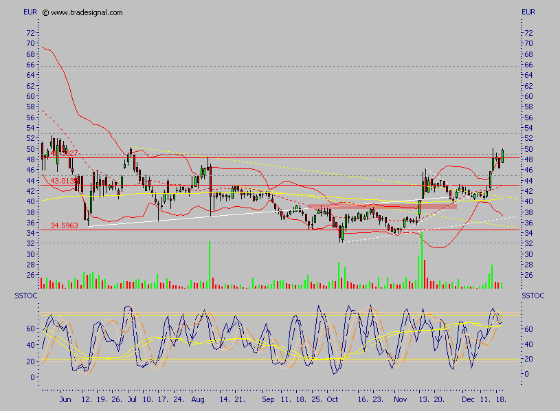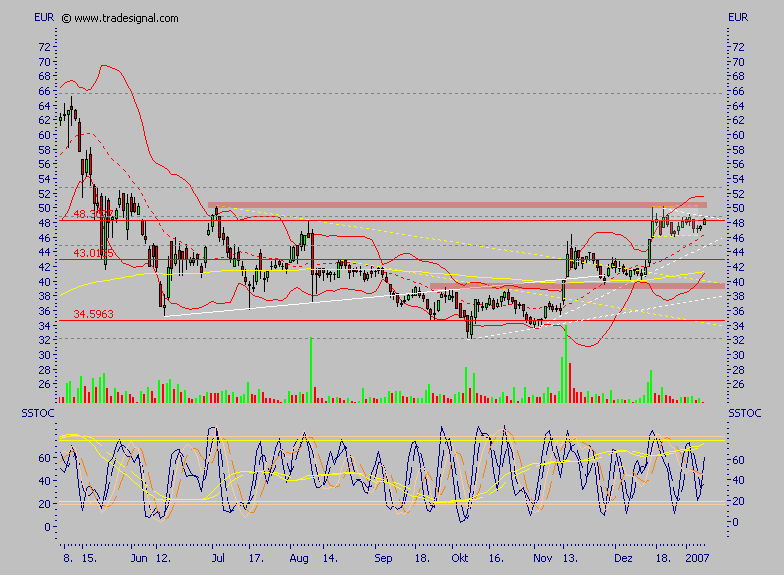 Am Freitag sei schließlich der Sprung über das jüngste Verlaufshoch vom 15.11.2006 bei 46,40 Euro gelungen. Im Anschluss hätten die nächsten Kursziele in Form des Hochs vom 08.08.2006 und 04.07.2006 bei 48,41 Euro und bei 50,35 Euro bereits ausgelotet werden können. Nach einer kurzen Verschnaufpause, die zu einem Schließen des frischen Aufwärts-Gaps bei 45,70/45,93 Euro führen könne, wäre damit mittelfristig der Weg frei, die Jahreshochs vom April/Mai bei gut 65 Euro in Angriff zu nehmen.