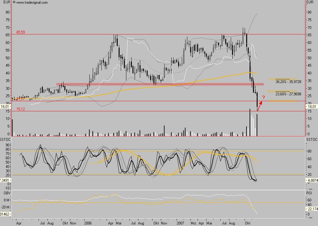 Ich habe mir auch nochmal sämtliche Kennzahlen des Unternehmens angesehen und komme insbesondere aufgrund des Kurs-Umsatz-Verhältnisses, das für einen Solarwert sehr niedrig ist (bei aktuellem Kurs: 2006er KUV unter 1, 2007er KUV schätze ich auf ca. 0.6) zu dem Schluss, dass der Kursrutsch in diesem Ausmass nicht gerechtfertig ist.