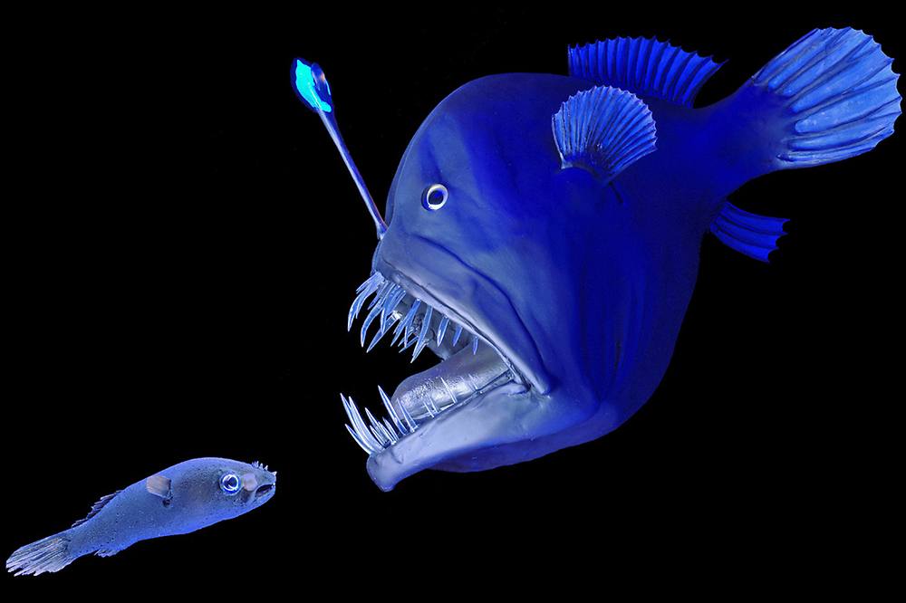 (Der Schwarzangler lockt mit seiner leuchtenden Angel Beutetiere an)