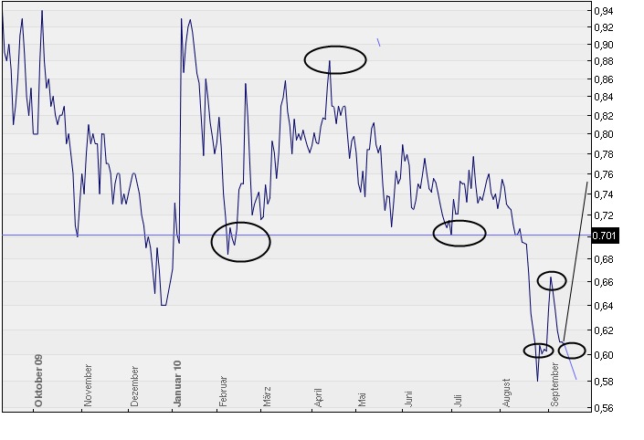 Jedoch muss man doch auch klar erkennen, dass Conergy in diesem Jahr bis auf die horizontalen Chartwiderstände bei 0,78 € und 0,68 € nie charttechnisch zu erfassen war. So lange es keine neue News gibt oder der Gesamtmarkt nicht groß einnicken wird, solange wird Conergy zwischen 0,60 bis 0,65 e laufen. Ganz analog zu der Seitwärtsrange bei Conergy zwischen 0,80 bis 0,85 € und 0,70 bis 0,75 €. Diese Seitswärtsranges waren doch bei Conergy super gut zu erkennen. Jetzt spielt sich bei Conergy halt alles eine oder zwei Etagen tiefer ab.