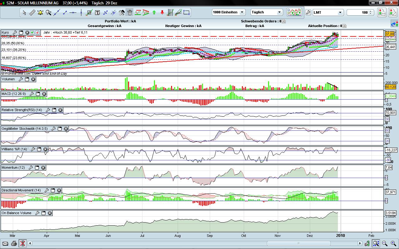 Bei den Voluminas gebe ich Fibonacci nicht recht, denn gestern hatten wir bei dem tollen Intraday Rebound immerhin ein Handelvolumina von 2 Mio. € und das trotz der Tage zwischen Weihnachten und Neujahr, wo es eh geringe Handelsvolminas gibt . Außerdem wurden vor Weihnachten bei steigenden Kursen auf Xetra-Basis über 100.000 Aktien täglich, also fast 4 Mio. € Handelsumsatz, umgesetzt. Bei solchen Handelsvolumina braucht sich Solar Millenium nun wirklich gegenüber anderen Tech-DAX Werten nicht verstecken. Alleine der Vergleich mit Conergy zeigt, dass das Handelsvolumina in Mio. € von Solar Millenium fast um den Faktor zwei höher liegt.