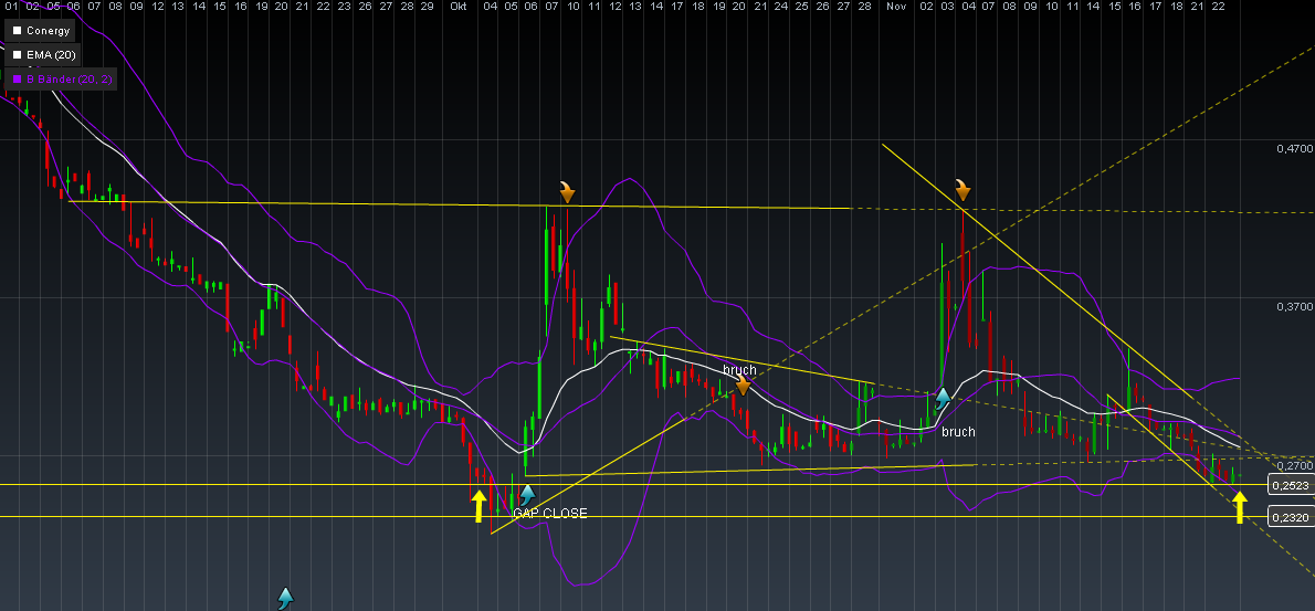 wer hier zocken möchte kann es jetzt probieren oder er wartet bis die trendlinie bestätigt oder gebrochen wird ... ausserdem gesamtmarkt beobachten .. aber für heute.. im 4 std -  0,252  erstens gapclose und zweitens unterstützung gelbe pfeile + linie . platz nach unten wäre aber noch siehe downkanal 23,2 und BB .von ema hat sich cony verabschiedet.   am der trendlinie hangelt sich der kurs zur zeit nach unten..  sl würde ich dann bei 21 was setzen. muß man aber die nächsten stunden/ tage beobachten weil sich die marken mit der zeit auch ändern