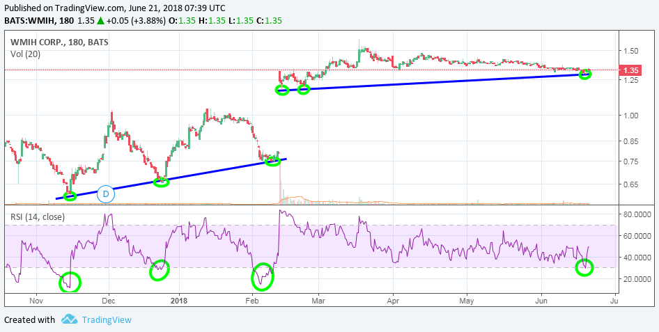 Womöglich war mit $1.29 ein lokales tief erreicht. Gestern mit dem SK $1.34 drehte der RSI scharf nach oben, wie schon ein paar mal in der Vergangenheit (grüne Kreise).