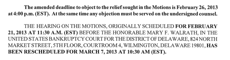 Am 30.November 2012 reichte der WMIH Liquidating Trust (LT) einen Antrag zur Genehmigung einer Untersuchung gegen GS ein. Einwände gegen diesen Antrag sollten bis spätestens 20.Dezember 16.00Uhr Ortszeit eingebracht werden. Diese "Einwandsfrist" wurde bis 13.Februar 2013 verlängert (siehe WMI-Kalender)