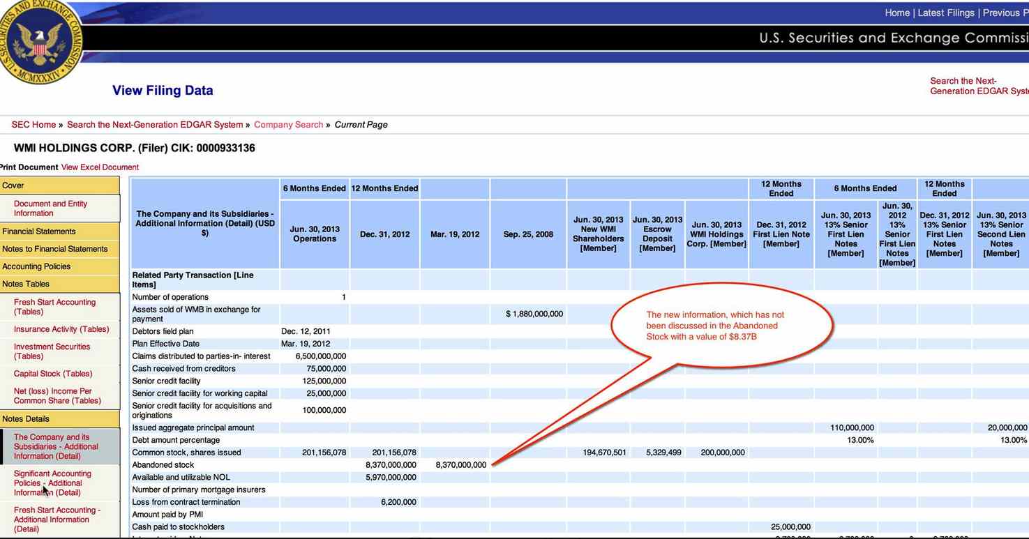 [...] based on our analysis, we believe WMIHC experienced an ownership change under Section 382 of the Internal Revenue Code (the “Code”). Prior to emergence, WMI abandoned the stock of WMB, thereby generating a worthless stock deduction of approximately $8.37 billion, which gives rise to a net operating loss carry forward (“NOL”) for the year ended December 31, 2012. We believe that the total available and utilizable NOL carry forward at December 31, 2012 was approximately $5.97 billion and at June 30, 2013 there was no limit under Section 382 of the Code on the use of these NOLs (see Note 6: Federal Income Taxes). [...]