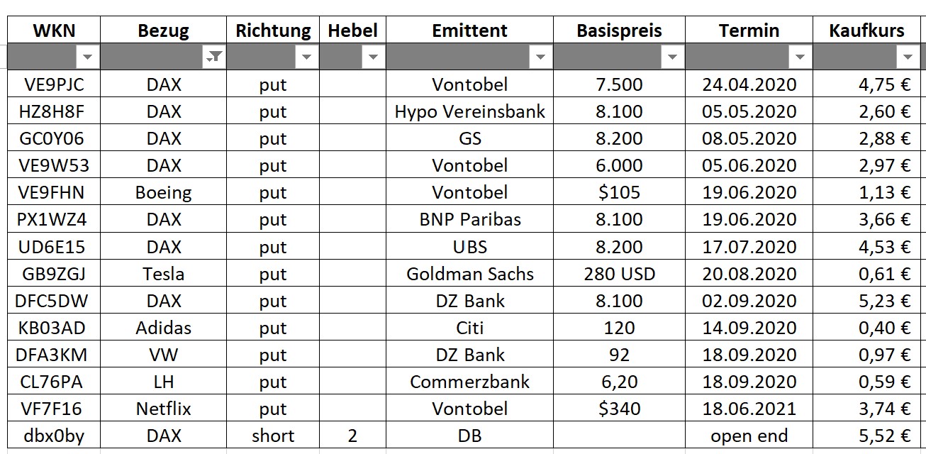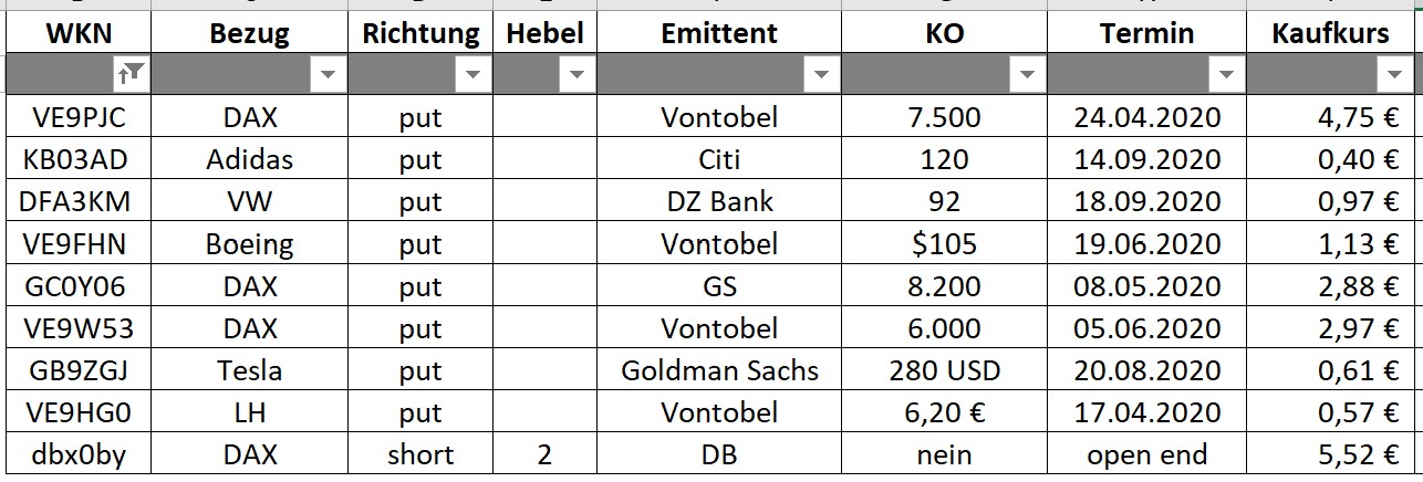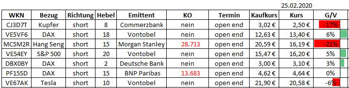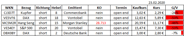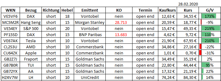 Schon seit 28.01. bin ich mit diesen Zertifikaten short und habe die Tage danach immer etwas nachgekauft. Ich bin der Meinung, dass die Zahlen, die China zum Coronavirus meldet viel zu niedrig sind und nicht real.