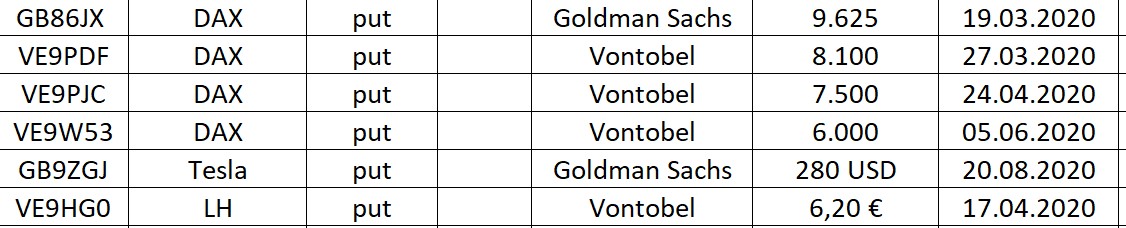 Seit letzter Woche habe ich in vier Short Zertifikate investiert, die 8x bis 20x gehebelt short auf den Hang Seng, DAX, S&P 500 und Kupfer gehen. Es können hier nur drei Wertpapiere zugeordnet werden, das vierte auf den S&P 500 ist die VE54EY.