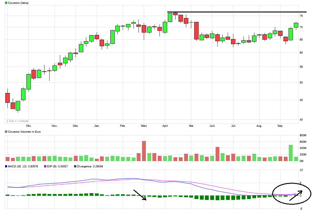 Obwohl die Papiere, gemessen am Schlusskurs vom Dienstag, mit 3,7 Prozent Abschlag veräußert wurden, legte der Kurs am Mittwoch in ähnlicher Größenordnung zu. Covestro wird als Kandidat für den Aufstieg in den DAX gehandelt.